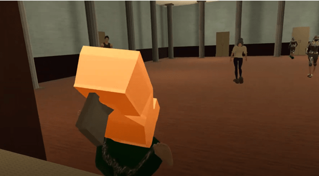 The player begins in this cozy little nook with lighting on both sides and shoes behind them, and there is a wide-open ballroom in front of them with large columns. The wide-open ballroom allowed the player to watch people approaching from a distance, which was good for our puzzle mechanics. If the player has a good memory, they can see which shoes people are wearing when they approach and prepare by grabbing that shoe from the file before the person arrives. It adds strategic complexity to our very simple game style and wouldn’t have worked nearly as well without an effective environment setup.