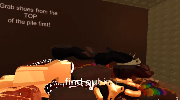 A key part of our game’s design was that players needed to take shoes off the top of the pile before grabbing shoes from the bottom of the pile. This creates an interesting puzzle mechanic where if players make a mess of the shoe pile, they will have difficulty later finding the shoes they needed. Unfortunately, this puzzle-style mechanic broke a key tenet of VR design: “Don’t lock objects the player thinks they can pick up.”